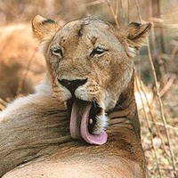 ![]() ![]() ![]() ![]() The cause of the first two expressions is a bit racy. Let's say it roughly translates, "YESSS!!" The third is good old fashioned grooming, but it makes my tongue cramp just watching it! The man, like the lion, opens his mouth in a moment of extreme pleasure, but cannot lick his own neck. |